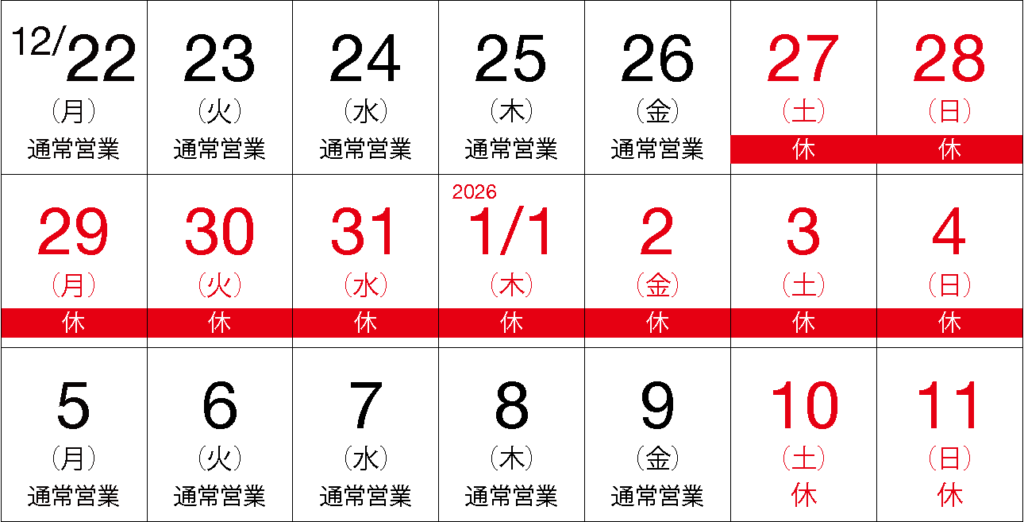 ãƒ¼ä¼‘æ¥æœŸé–“ー 2025å¹´12月27日(土)ã‹ã‚‰2026å¹´1月4日(日)ã¾ã§ 2026å¹´1月5æ—¥ã‹ã‚‰é€šå¸¸å–¶æ¥ã¨ã•ã›ã¦ã„ãŸã ãã¾ã™ã€‚